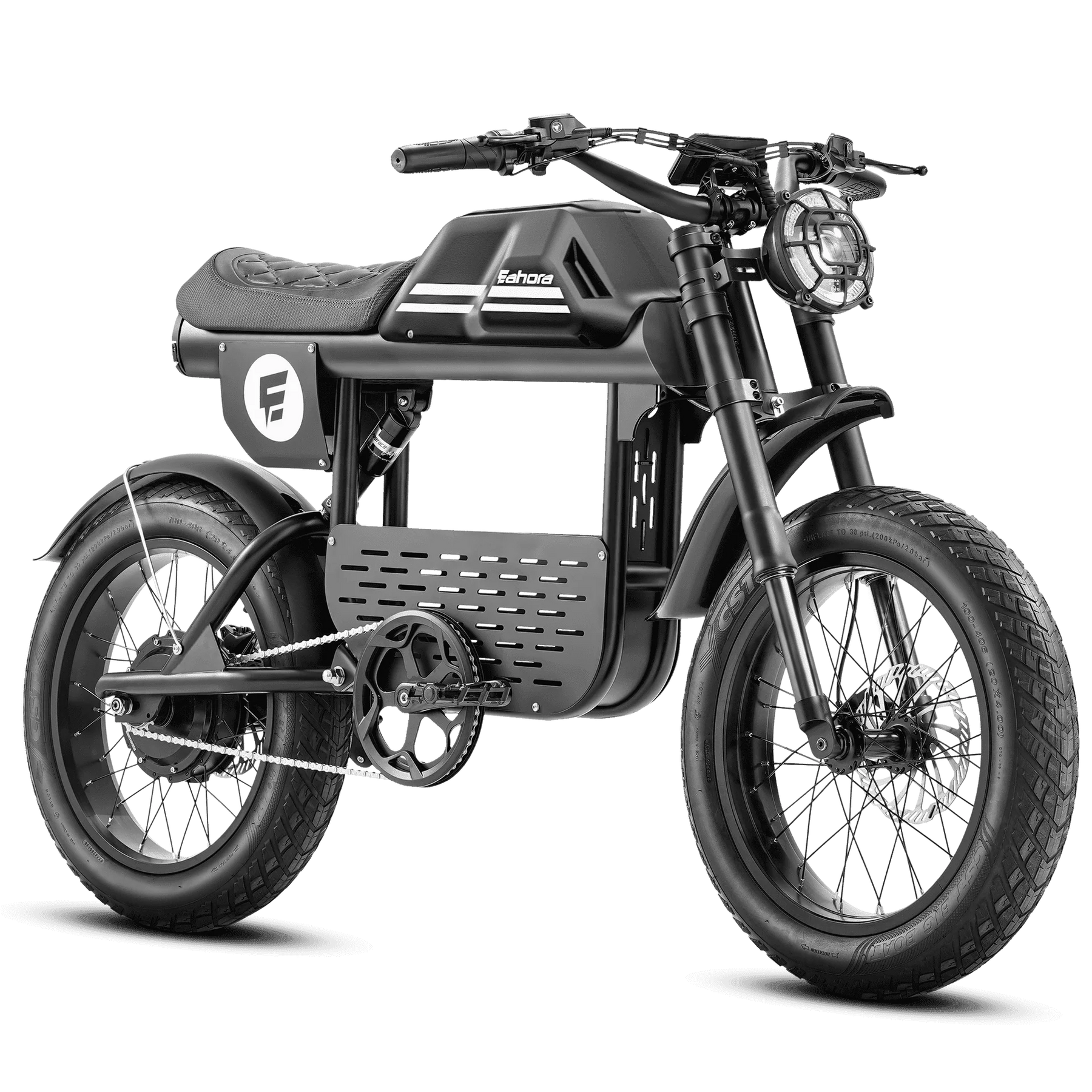 - 20" * 4.0" tires; tire pressure marked on sidewall.